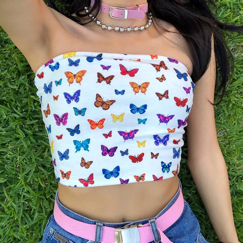 Off-Shoulder Butterfly Print Crop Top Tank Top
